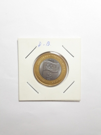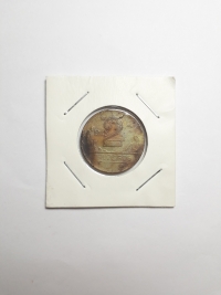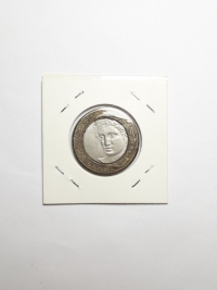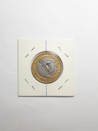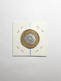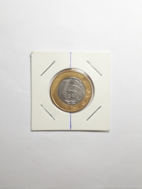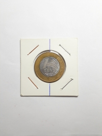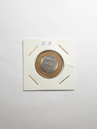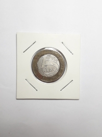 Moeda comemorativa dos Jogos Olímpicos Rio 2016 "Entrega da Bandeira Olímpica"; Núcleo: Aço Inox; Anel: Aço revestido de Bronze 7gr 27mm. Foram produzidas 2.016.000 unidades.