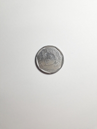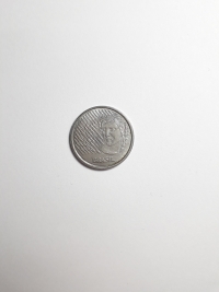 1ª família do Real. No anverso, efígie da República. Aço Inoxidável 4,8gr 23,5mm. Foram produzidas 285.000.000 unidades.