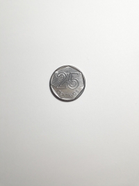 1ª família do Real. No anverso, efígie da República. Aço Inoxidável 4,8gr 23,5mm. Foram produzidas 285.000.000 unidades.